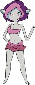 Plum es una humanoide pálida y es un animal del mar, que tiene una cola de sirena al entrar al agua. Ella tiene un pelo corto de color rosa en el frente y púrpura oscuro atrás, sus mejillas son rosadas, tiene 3 dedos en cada mano y 2 en cada pie. Ella lleva una camisa rasgada de color rosa y una falda corta de color rosa. La radiografía de su cráneo se muestra que sus ojos son de color púrpura. Los chicos describen sus manos como "manos de cerdita".